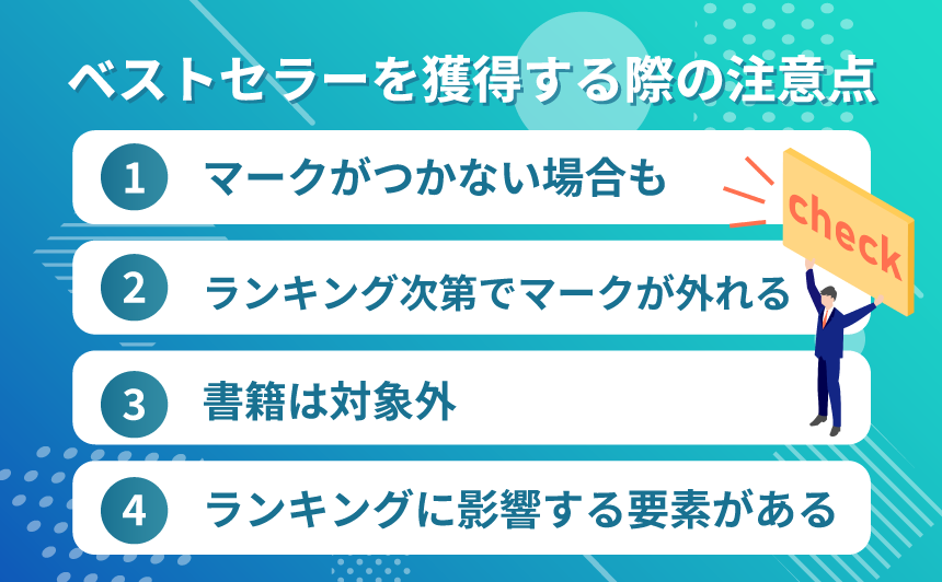 もちろんベストセラーを獲得することには信頼性の向上や売上の増加といった多くのメリットがありますが、ランキングの変動や書籍カテゴリーの対象外、外的要因が影響するなど注意点も存在します。