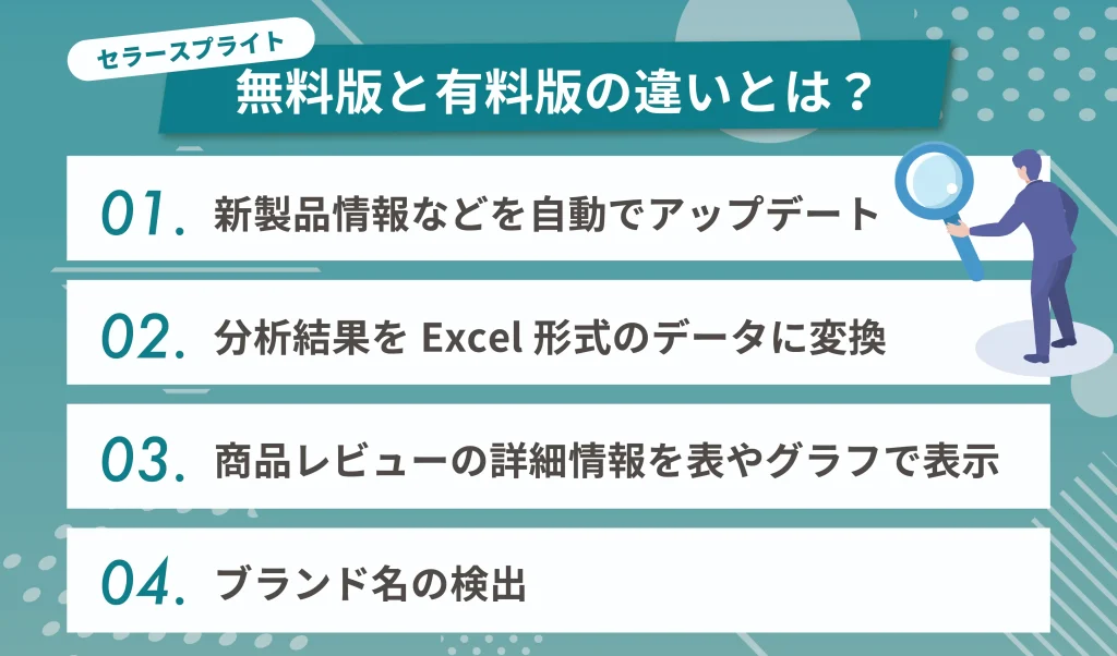 ただし、セラースプライトには無料版と有料版があり、利用できる機能に大きな違いがあるのも事実です。どちらが自社のビジネスに最適かを見極めるために、両者の違いをくわしく見ていきましょう。