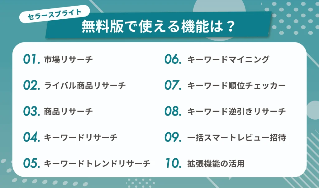 セラースプライトの無料版では、商品リサーチやキーワード分析など基本的な機能を体験できます。