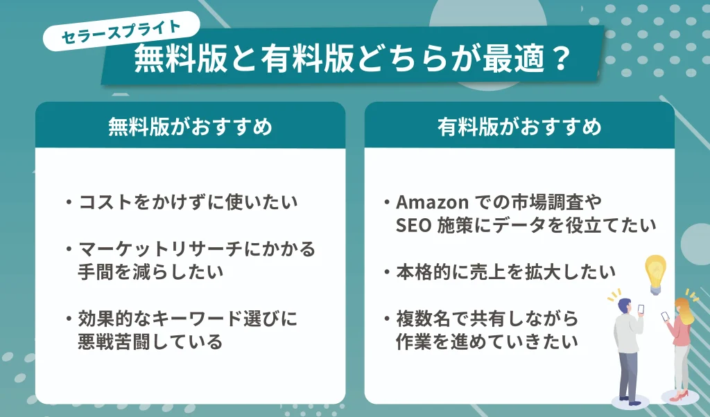 ここまで、セラースプライトの無料版と有料版の違いやそれぞれの機能についてくわしく見てきました。最後に「無料版・有料版はどちらが最適か?」について考えてみましょう。