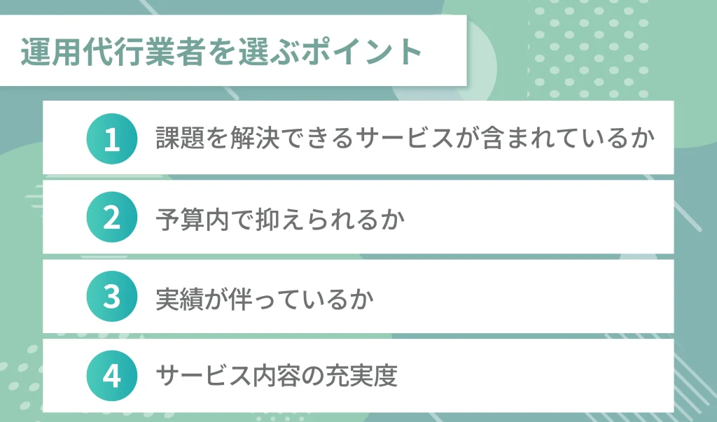 運用代行業者を選ぶ際には、自社にあった企業を選ぶ必要があります。