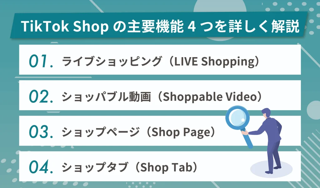 TikTok Shopは、動画とECを融合した革新的な購買体験を提供するため、4つの主要機能を備えています。