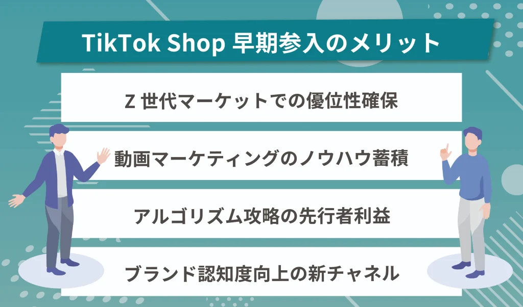 2025年6月のサービス開始を控え、TikTok Shopへの早期参入は競合他社に対する大きなアドバンテージとなります。新しいプラットフォームだからこそ、得られる先行者利益は計り知れません。
